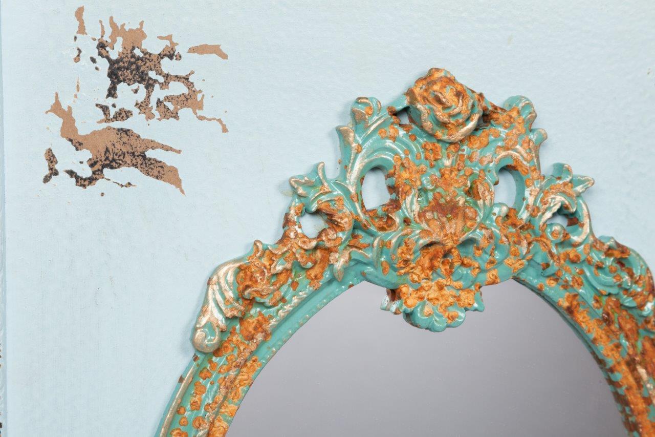 Зеркало Geoffrey в форме овала вмонтировано в оригинальную деревянную ель оправу, прямоугольной формы. На оправу нанесен рисунок оранжевого и голубого цвета. Зеркало создаёт гармонию и уют интерьера. Зеркало — это обязательный предмет интерьера. В это зеркало хочется не только смотреться, но и любоваться им.